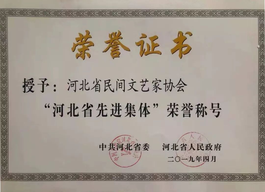 为庆祝中华人民共和国成立七十周年,中共河北省委、河北省人民政府在全省开展先进集体和先进个人评选活动,并隆重举行表彰仪式。在自下而上的推荐活动中,经过层层评选,公示,河北省民间文艺家协会荣膺殊荣,被中共河北省委、河北省人民政府授予 “河北省先进集体”荣誉称号。