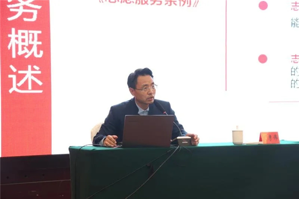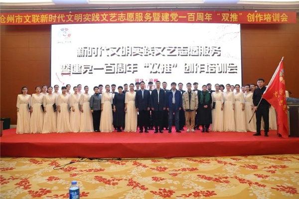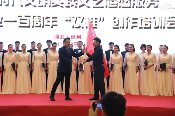 冀彦伟向沧州市文联文艺志愿服务团授旗,并作了题为《如何做好新时代学雷锋文艺志愿服务》的讲座。