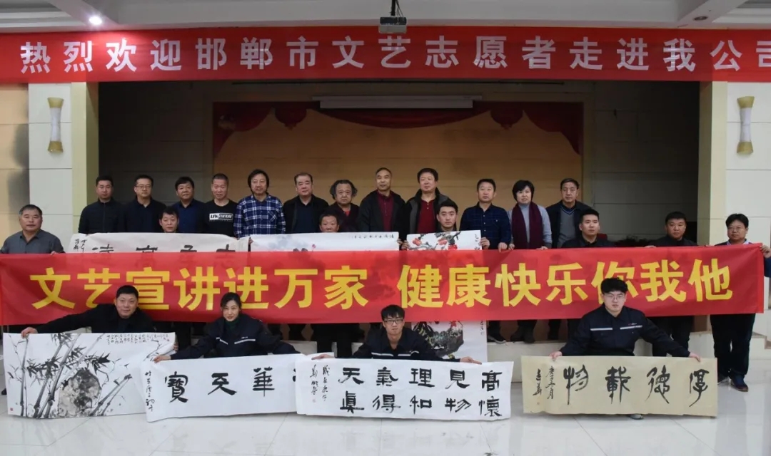 11月29日,由邯郸市文联组织的“文艺宣讲进万家 健康快乐你我他”文艺志愿服务活动来到涉县石岭工业有限公司,市文联党组书记、主席张全民,秘书长郑彬,涉县文联主席李建荣及部分知名书画家等参加活动。