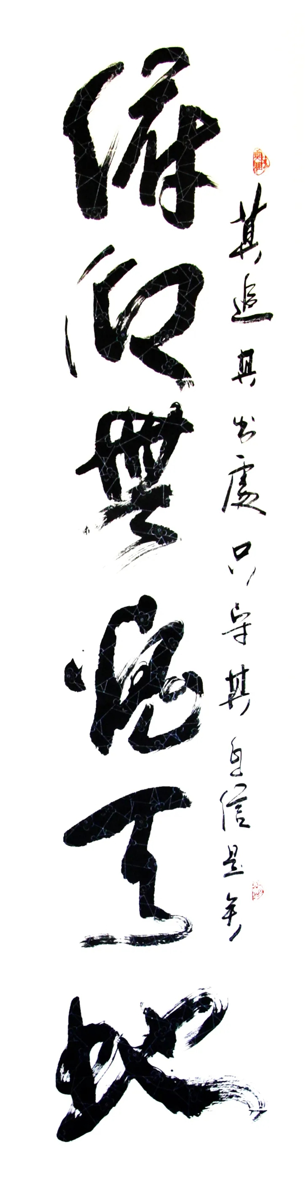要创作一幅好的书法作品,我认为,关键是立意的问题。要认真研究书写内容,抒情性内容要写得飘逸潇洒,经典性内容则要写得高古灵妙。要仔细考虑书写格式,依据书写内容和尺幅大小等,综合考虑点画线条的力量感、节奏感和立体感等。还要认真研究每个字的字形,就要把《说文解字》当作案头书去读。当然,书写的整体布局也是非常重要的。如何疏密得间、计白当黑,如何奇正相生、变化多姿,要力求使整体布局呈现上下左右呼应、通篇团聚不散的艺术效果。