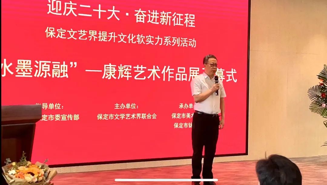 6月27日,“迎庆二十大 奋进新征程”保定文艺界提升文化软实力系列活动“水墨源融——康辉艺术作品展”在TIME中勘双创园钛美术馆隆重开幕。保定市委常委、宣传部部长曹海波宣布画展开幕,市文联党组书记雷彦民、市美协主席刘发起、TIME中勘双创园董事长张永革为展览致辞。保定市政协副主席、民进保定市委主委、华北电力大学自动化系主任王印松、民进保定市委专职副主委袁晨光、保定市竞秀区副区长张立辉等领导出席。