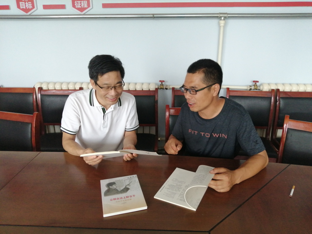 方竹学与杜彦明讨论《让群众过上好日子 习近平正定足迹》等书籍的学习使用情况