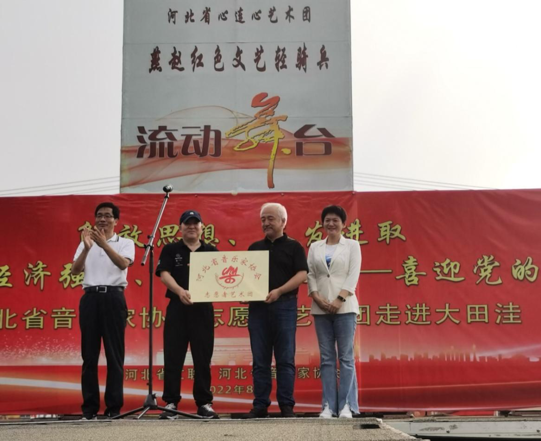 方竹学、郭玉红给河北省音乐家协会志愿者艺术团团长郝志明、书记刘颖授牌