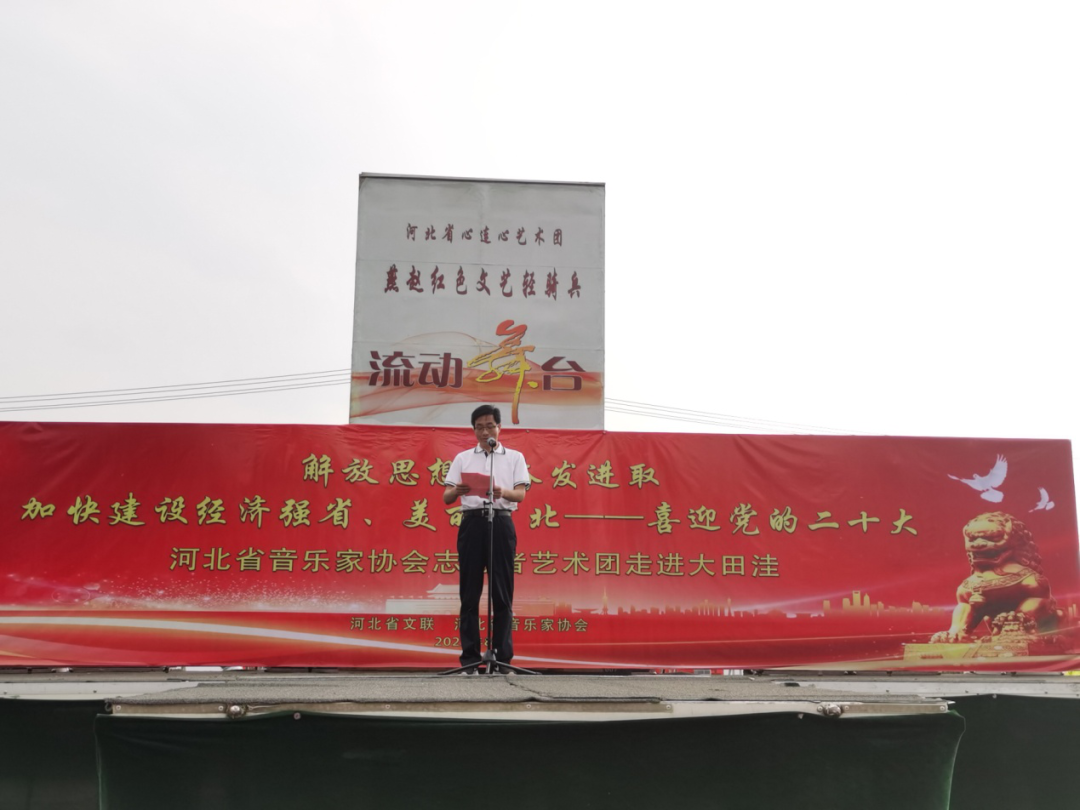 方竹学与郭玉红一起为“河北省音乐家协会志愿者艺术团”授牌,并致词。他指出:乡村振兴,既要塑形,也要铸魂。“文化”就是乡村振兴的魂。成立河北省音乐家协会志愿者艺术团,是省文联、省音协深入贯彻落实习近平总书记在中国文联第十一次全国代表大会上讲话精神、落实省委十届二次全会精神的具体举措,是发挥文艺浸润百姓心灵、歌声颂唱乡村振兴的作用的重要体现。他说:省文联领导多次到大田洼村调研指导、入户慰问和对接帮扶,3批驻村工作队与全体村民一起经历并见证了大田洼村脱贫攻坚的巨大胜利。在大田洼村举行授牌仪式和首场演出,是派出单位驻村帮扶后盾作用发挥的具体体现,是帮扶关系增强和深化,也是在大田洼村创新开展的一次“听党话、感党恩、跟党走”宣传教育活动。省文联将持续深入地学习习近平总书记文艺工作重要论述,坚持面向基层、服务群众,坚持解放思想、奋发进取,创新工作方式方法,更加有力有效地发挥文联在文艺惠民服务、文艺赋能乡村振兴、文艺提振精神、文艺服务发展等方面的作用。