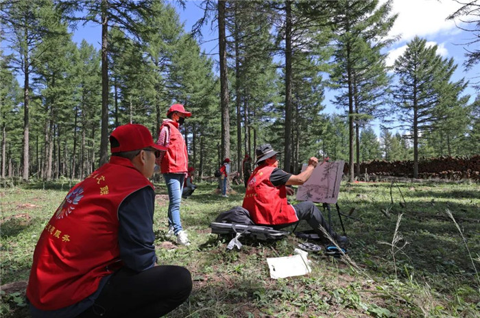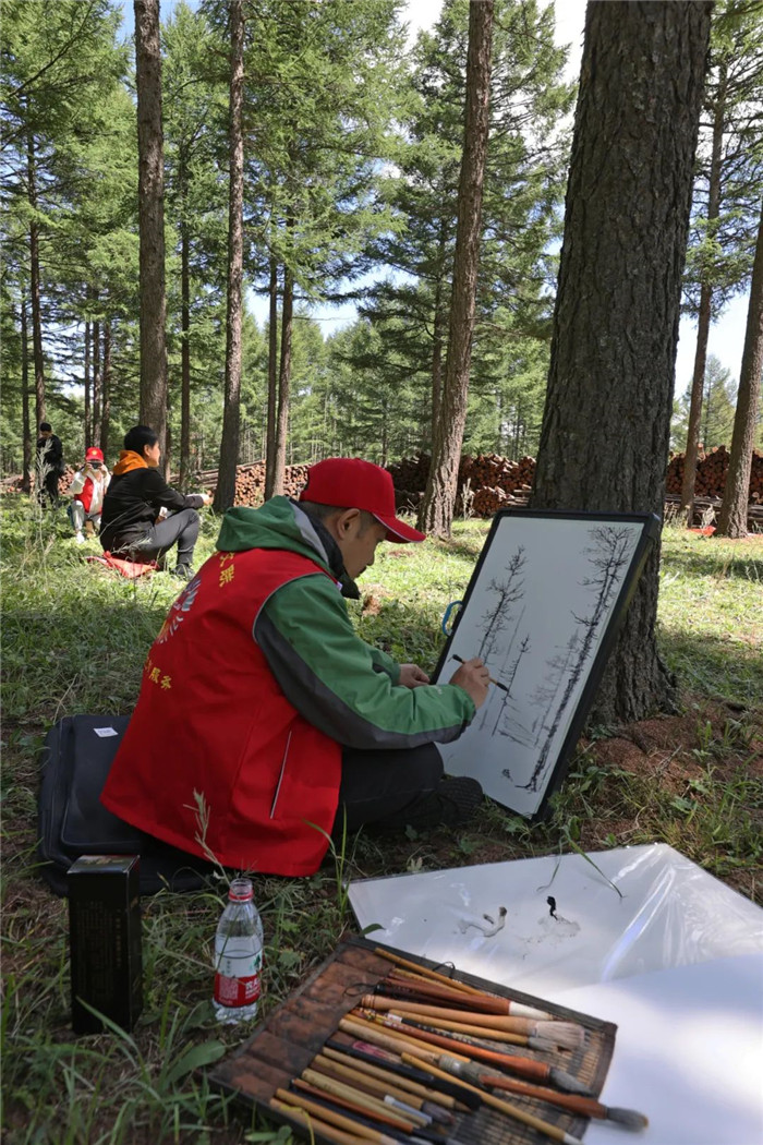 “此生未虚度,青山可标榜”。此次采风团一行本着致敬扎根荒原的建设者、描绘生态文明建设成果的初衷,背着画板,扛起器材,踏着护林员们不计其数的足迹深入林场深处,和一线干部职工交流,了解森林抚育、病虫害防治、防火、育苗等日常护林工作。摄影家的镜头里是基层林业工作者穿梭林间、一丝不苟测量数据的身影;美术家笔下是参天林海构建出的“绿色丰碑”。每个林场工作者都如王国斌一样质朴、勤奋,一天又一天用双脚丈量着塞罕坝护林防火的巡山路,辛勤守护着每一株树木健康成长,从沙漠到绿洲的故事,也是从树木到树人的践行。