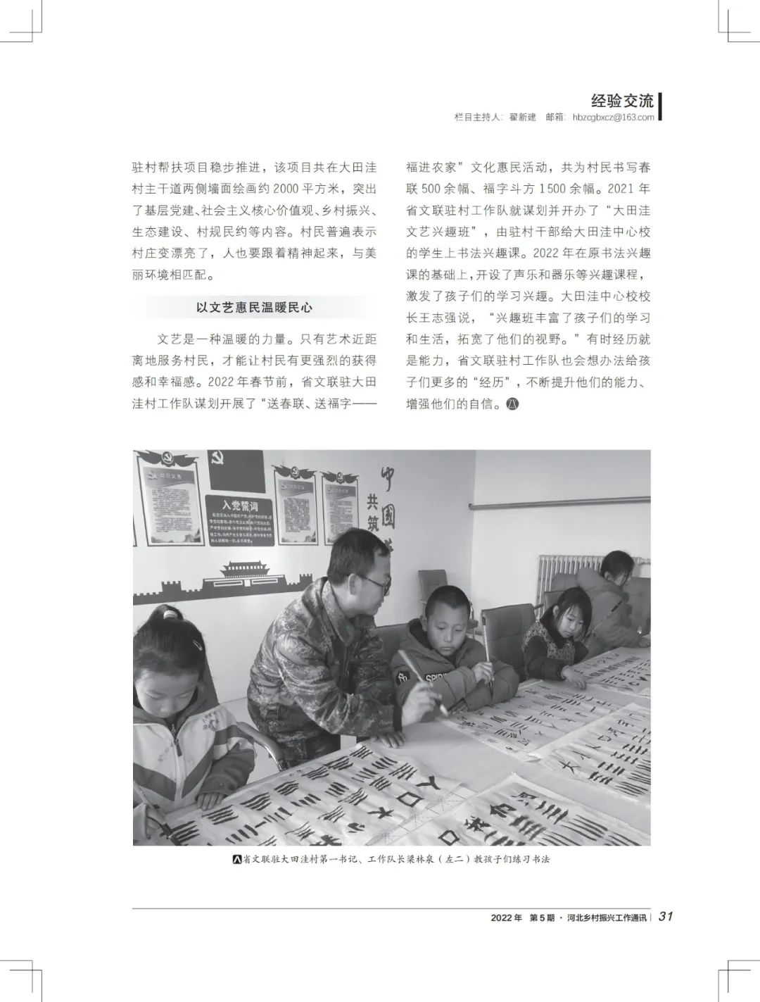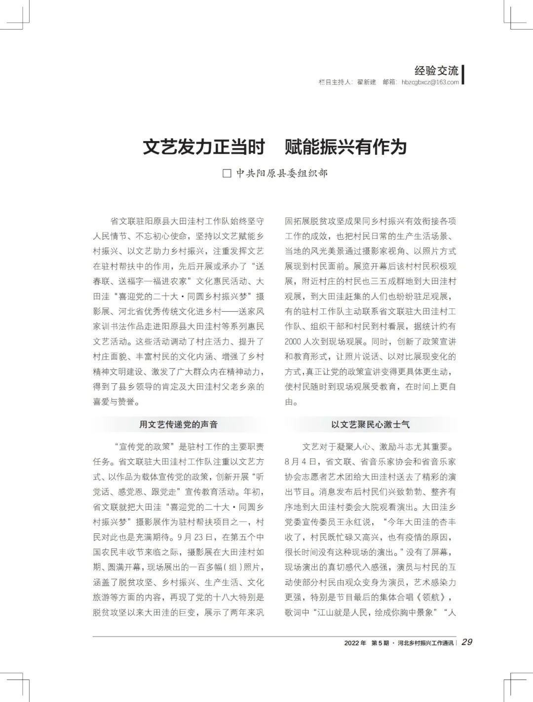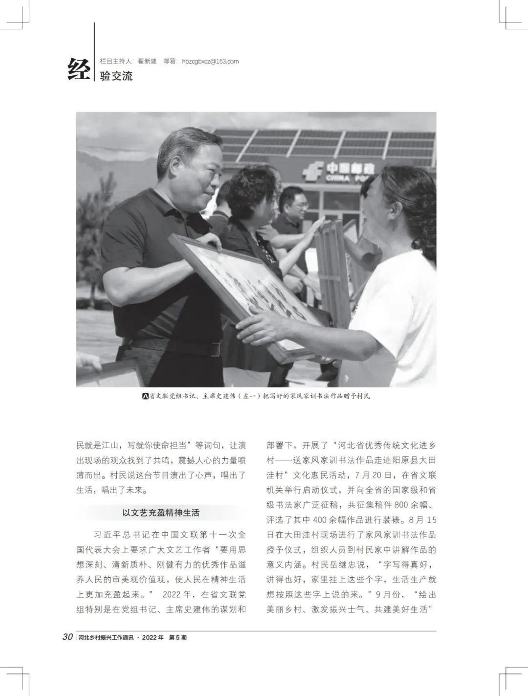 近日,《河北乡村振兴工作通讯》2022年第5期“经验交流”栏目以《文艺发力正当时 赋能振兴》,刊登省文联乡村振兴驻村帮扶工作的经验做法。