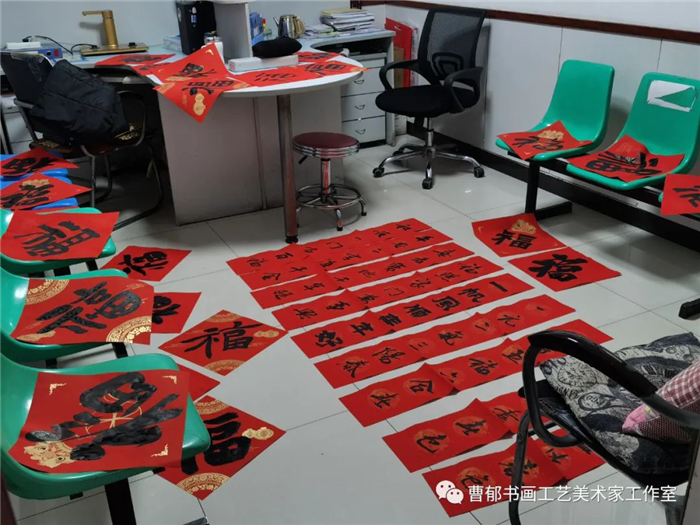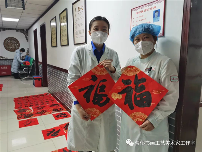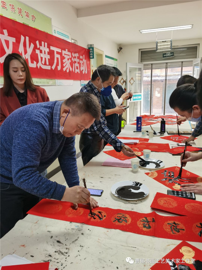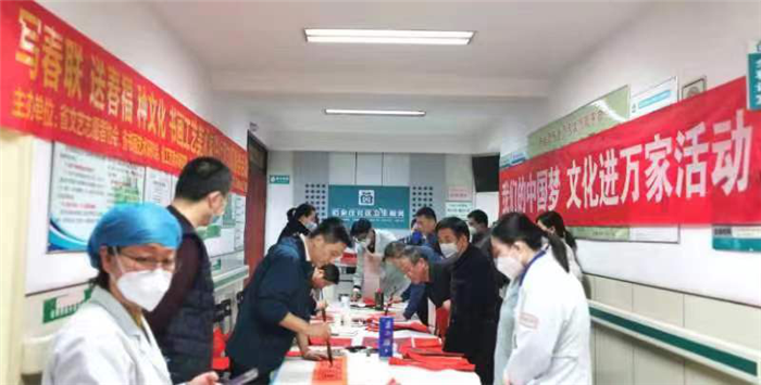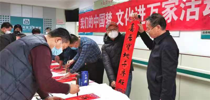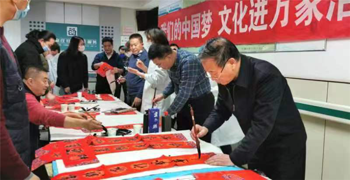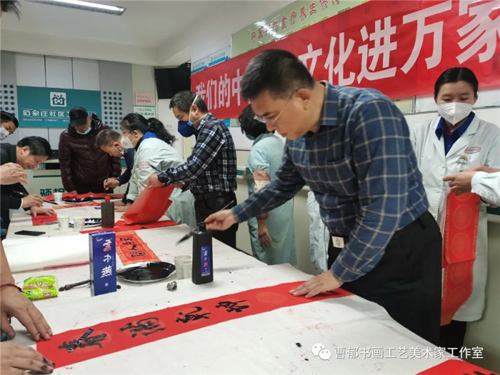 本次活动由省文艺志愿者协会、省书画艺术研究会、中共新华区委宣传部共同举办。余育国、刘厂军、曹郁、冯宏伟、焦清亮、孙红兵、曹克建、沈文运、刘久源、曹梦璇共10位书画文艺志愿者到泰安社区卫生服务中心,现场为社区广大居民和社区医护人员书写对联和福字500余幅,为该小区居民和曾战斗在抗疫一线的白衣天使们送去新春的慰问和祝福。