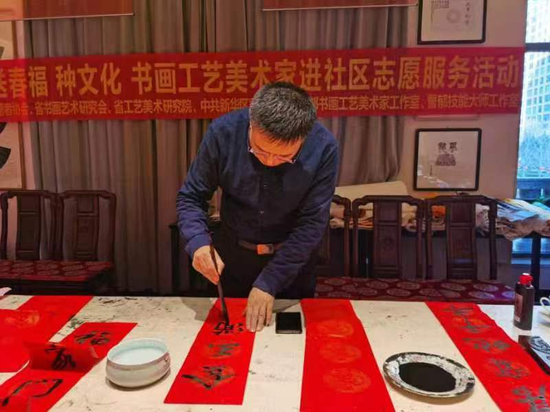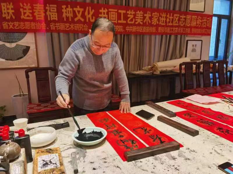 本次活动由省文艺志愿者协会、省书画艺术研究会、中共新华区委宣传部共同举办。刘厂军、曹郁、冯宏伟、王翠军、张铭、曹克建等6名文艺志愿者积极参与,现场为该社区群众书写对联和福字共200余幅,送去新春祝福。
