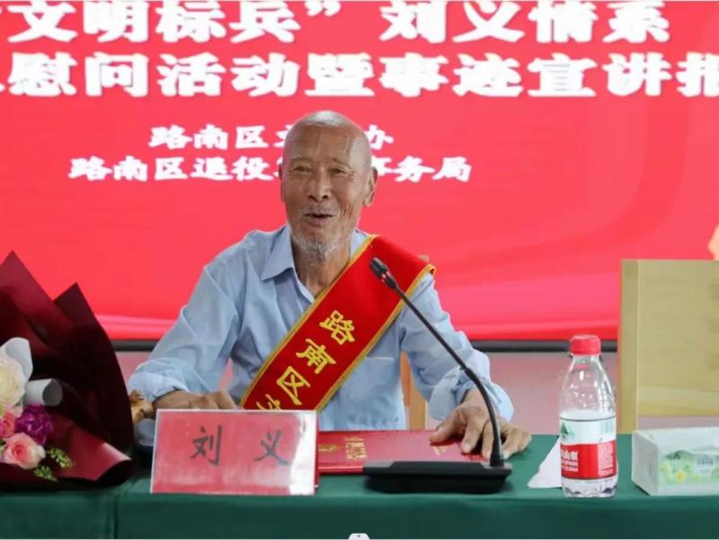 2023年4月7日,一场特殊的爱心捐赠仪式在刘义的家乡举行。刘义身着简朴的衣服,拄着拐杖,亲手将他拾荒得来的1万元钱送到10位残疾军人、军烈属和困难退役军人手中。这一举动感动了在场的所有人,大家将热烈的掌声送给刘义老人。刘义激动地说:“今天我是向老家的英雄致敬来了。我这一辈子是吃国家饭长大的,我总想为国家、为群众、为有困难的人做一些有意义的事!”