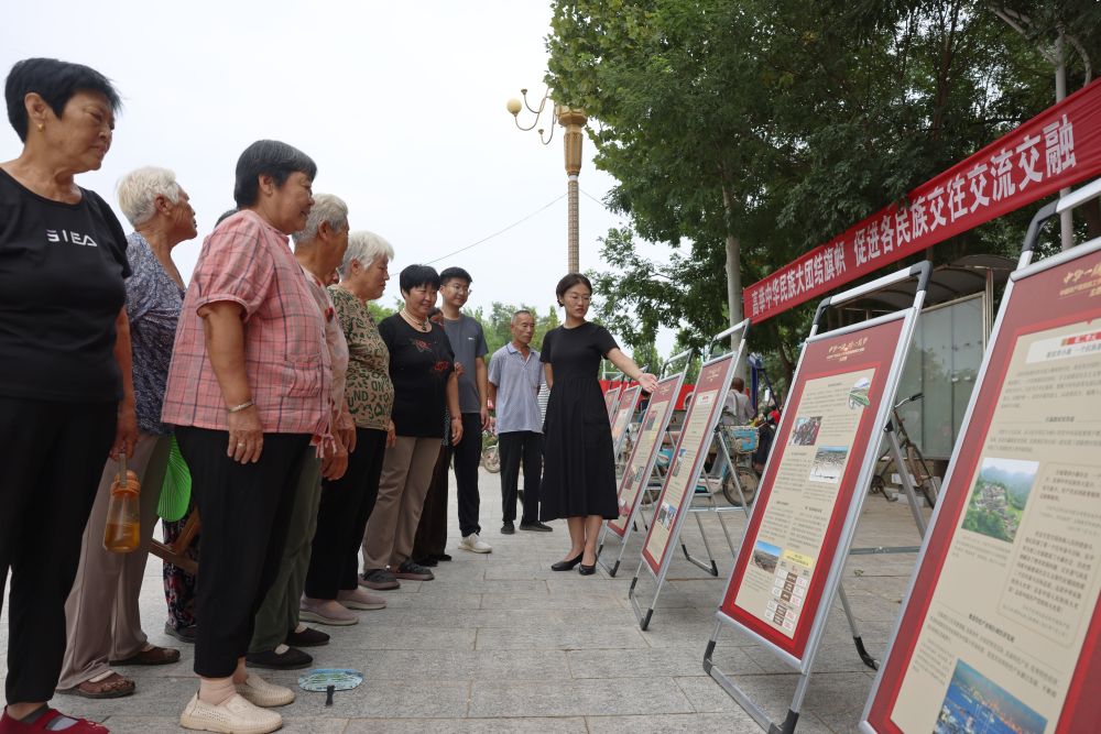 ↑9月4日,在新河县东董村脱脱文化园,工作人员引领群众参观党的民族工作百年历程主题展览。