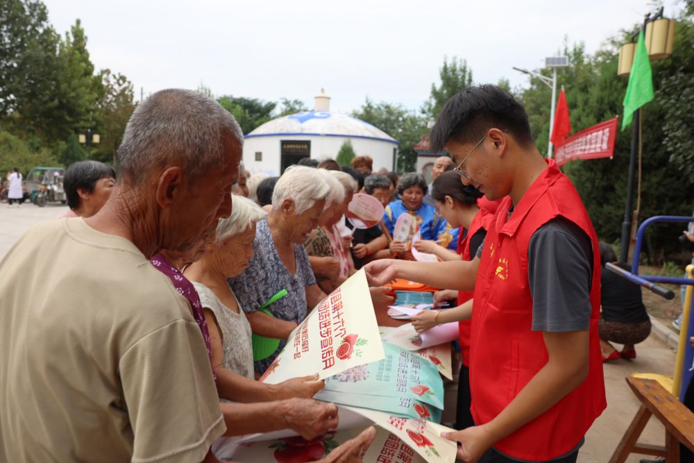 ↑9月4日,在新河县东董村脱脱文化园,志愿者向群众发放民族团结进步宣传月活动宣传画。