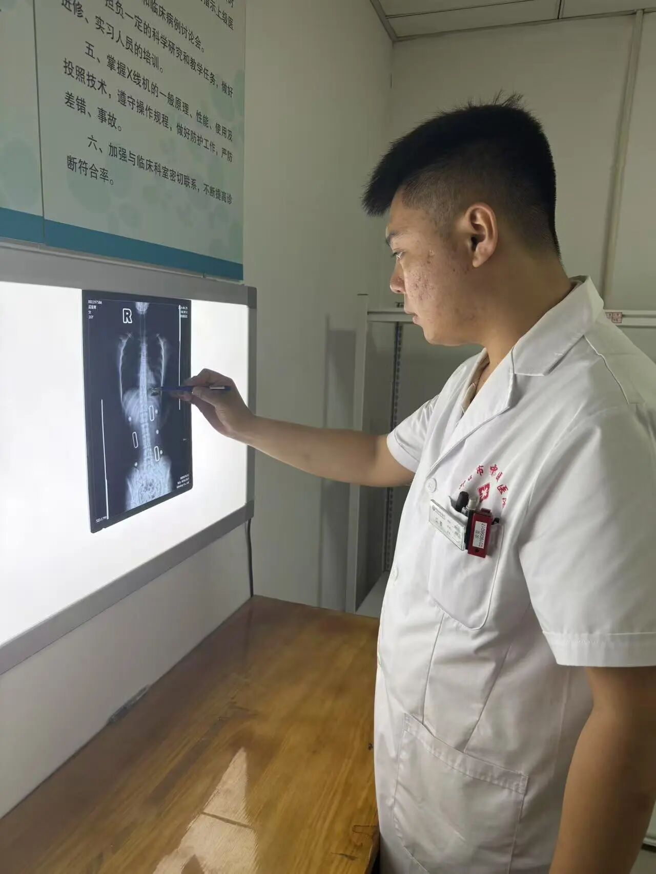 我们之间隔着一张简易桌子,桌上空荡荡的,X线拍片机、计算机断层扫描仪等各种机器发出低沉、深重、仿佛永不停歇的轰鸣声。自2020年入职,梁曌已经在这家医院工作四年多。源于对工作的热爱和对未来的期待,他勤勉好学,兢兢业业,践行着一个平凡医者的初心和使命。