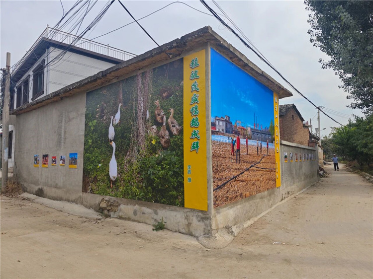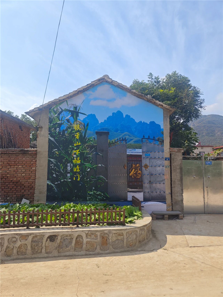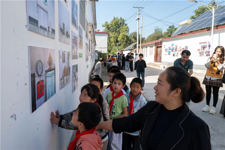 走在3个村庄里,展览本身就已是一道亮丽的风景线。组织者因地制宜,将村民的房舍外墙、院墙变为展墙。展出作品采用环保耐久的材料制作,适合在村内各类建筑物和场地长期悬挂、方便观赏,把展览融入乡村场景,形成了一种“艺术在田野,展览在生活”的美学。这种“村展”真正走进了乡亲们的日常生活,成为可感、可触、可品的新乡村景观。