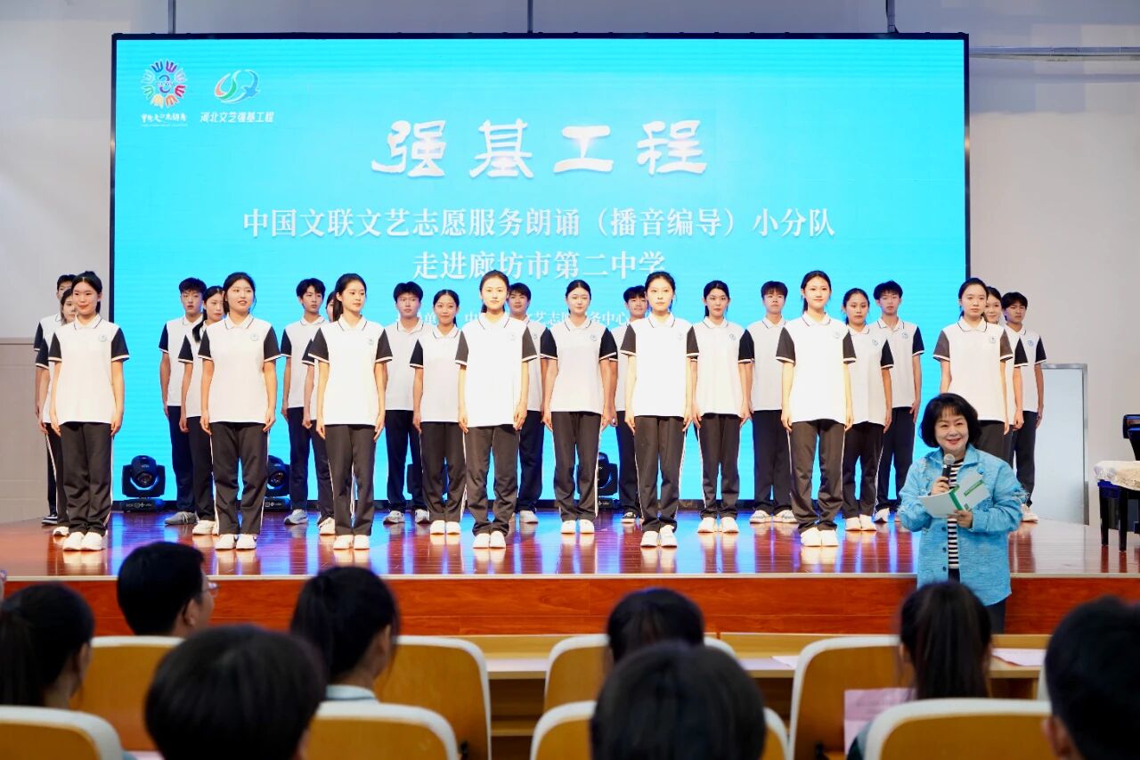 在廊坊市第二中学,央视著名主持人鞠萍与学生们亲切互动。学生们展示了自编自演的朗诵、小品等节目,鞠萍从语言表达、情感传递、舞台表现等多个角度给予专业指导,鼓励同学们坚守艺术梦想,勇敢表达自我,用声音传递正能量。