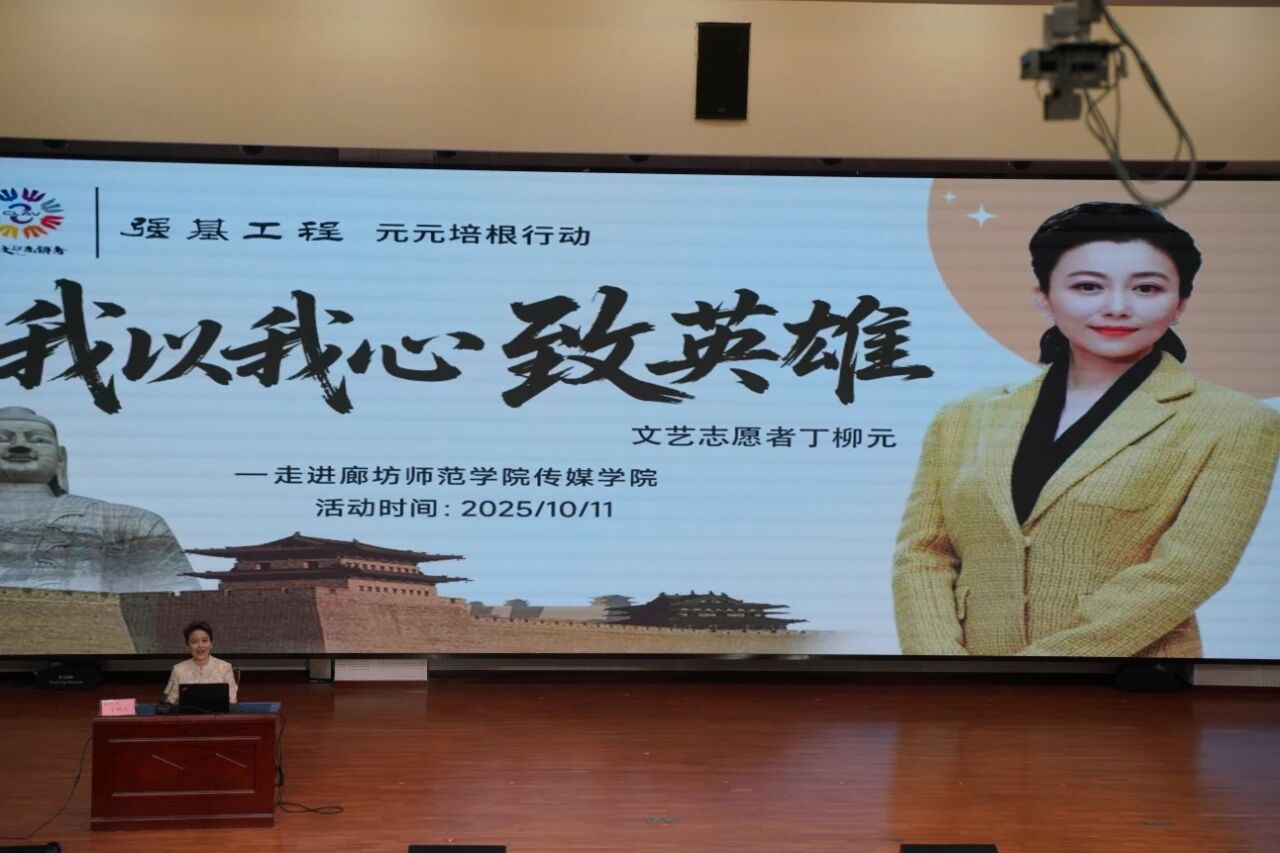 在廊坊师范学院,国家一级演员、导演丁柳元为传媒学院师生作主题演讲。她结合自身饰演江姐、杨开慧等角色的经历,诠释英雄精神,激发志愿服务热情。丁柳元表示,她创立“元元培根行动”,将文艺工作与志愿服务深度融合,推动红色文化成为青少年成长的精神养分??,并在传递志愿服务精神的过程中得到给养,成为更好的自己。