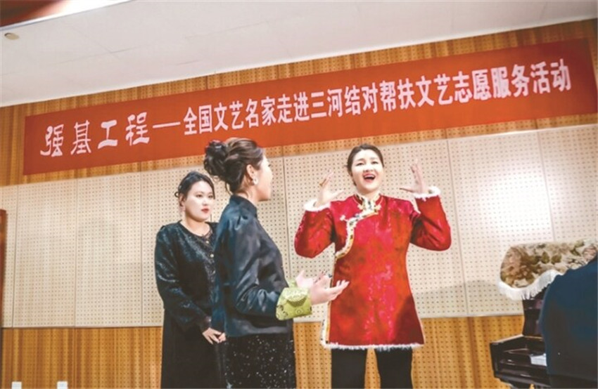 (三)常态化服务模式为支撑。围绕“强基工程”文艺结对帮扶任务,联合各级文明办、文联通过广泛调研摸底,梳理提出全省“强基工程”文艺结对帮扶项目,针对群众多样化、个性化的文艺需求,就近选派各级各艺术门类文艺志愿者结对,逐步探索出各级文艺家协会协同,国家、省、市、县、乡、村六级文艺志愿者联动,省内高校文艺联盟联合,多个文艺院团参与的文艺志愿服务“河北路径”。以结对帮扶为例,2024年至今,先后邀请降央卓玛、李伟建、平安等20位全国知名艺术家走进河北,组织500余名省级文艺家协会主席团成员、协会会员和高校教师持续跟进,联动万余名各级文艺志愿者广泛参与,长期深入各地农村、社区、学校等地,与基层群众文艺社团、文艺骨干和文艺爱好者结对子,累计开展2000余场次文艺结对帮扶活动,让广大群众直接受益。