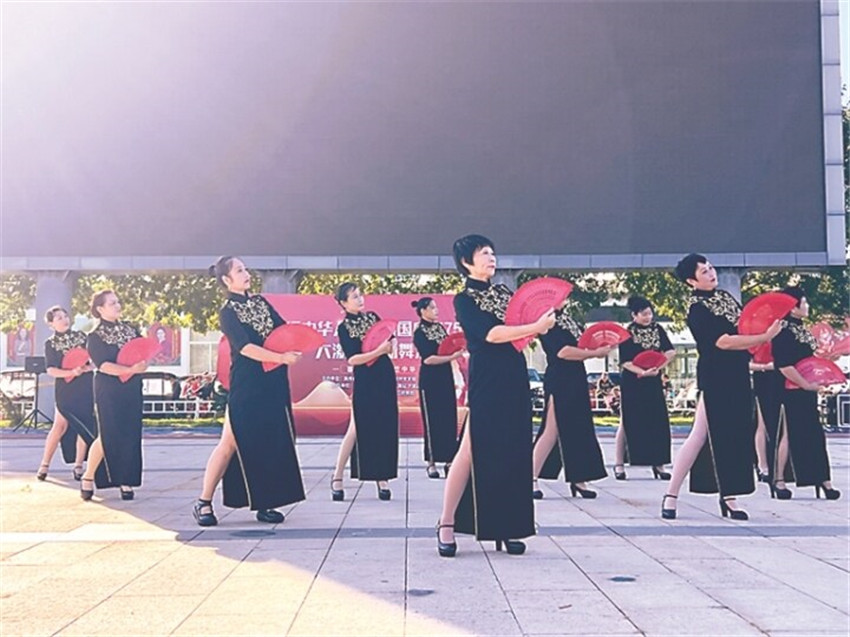 在文艺志愿者带领下,保定市竞秀区大激店镇大激店村村民正在排练舞蹈走秀节目。