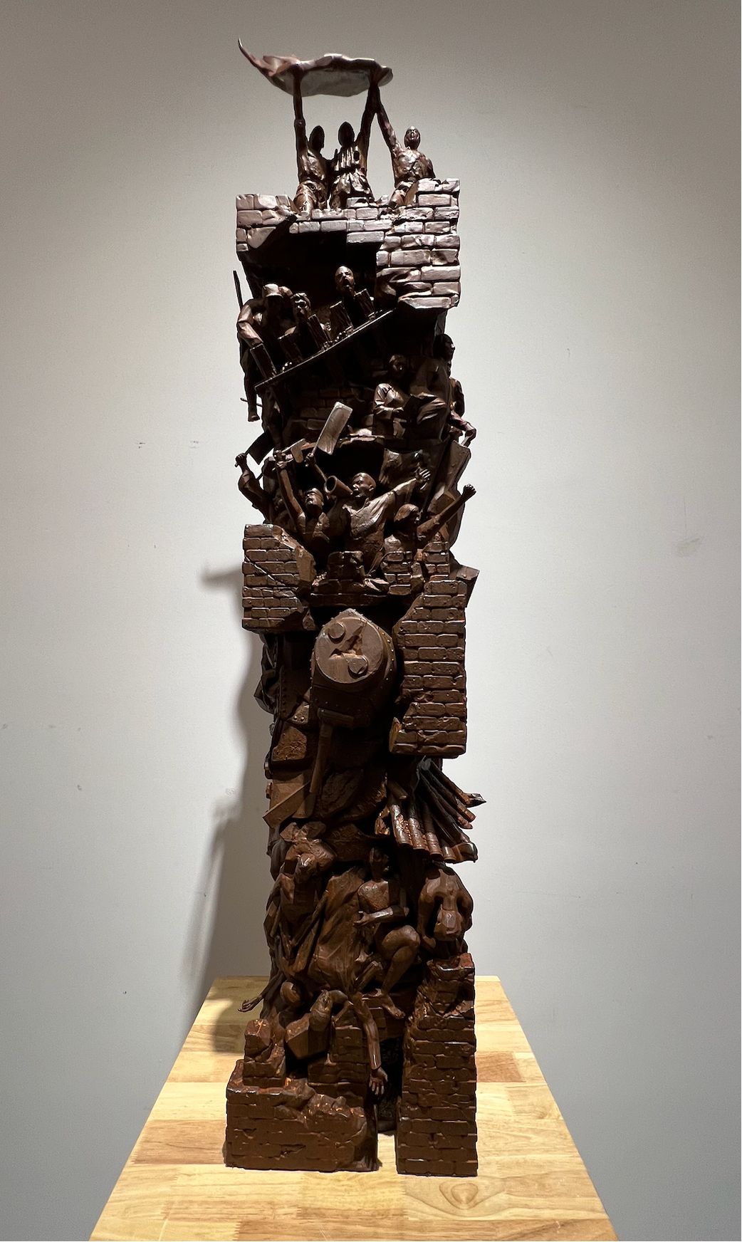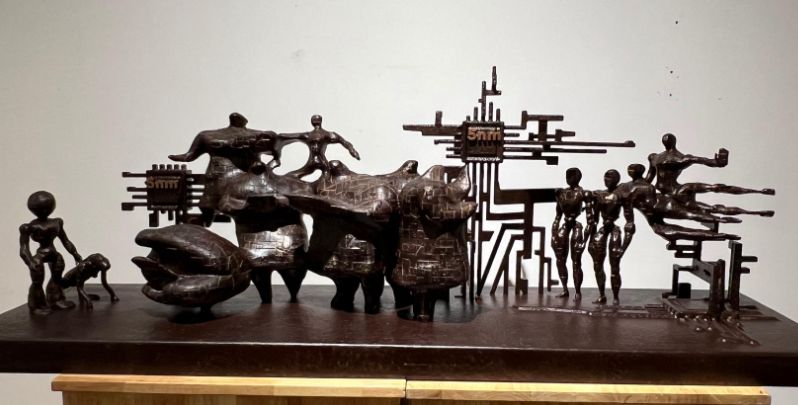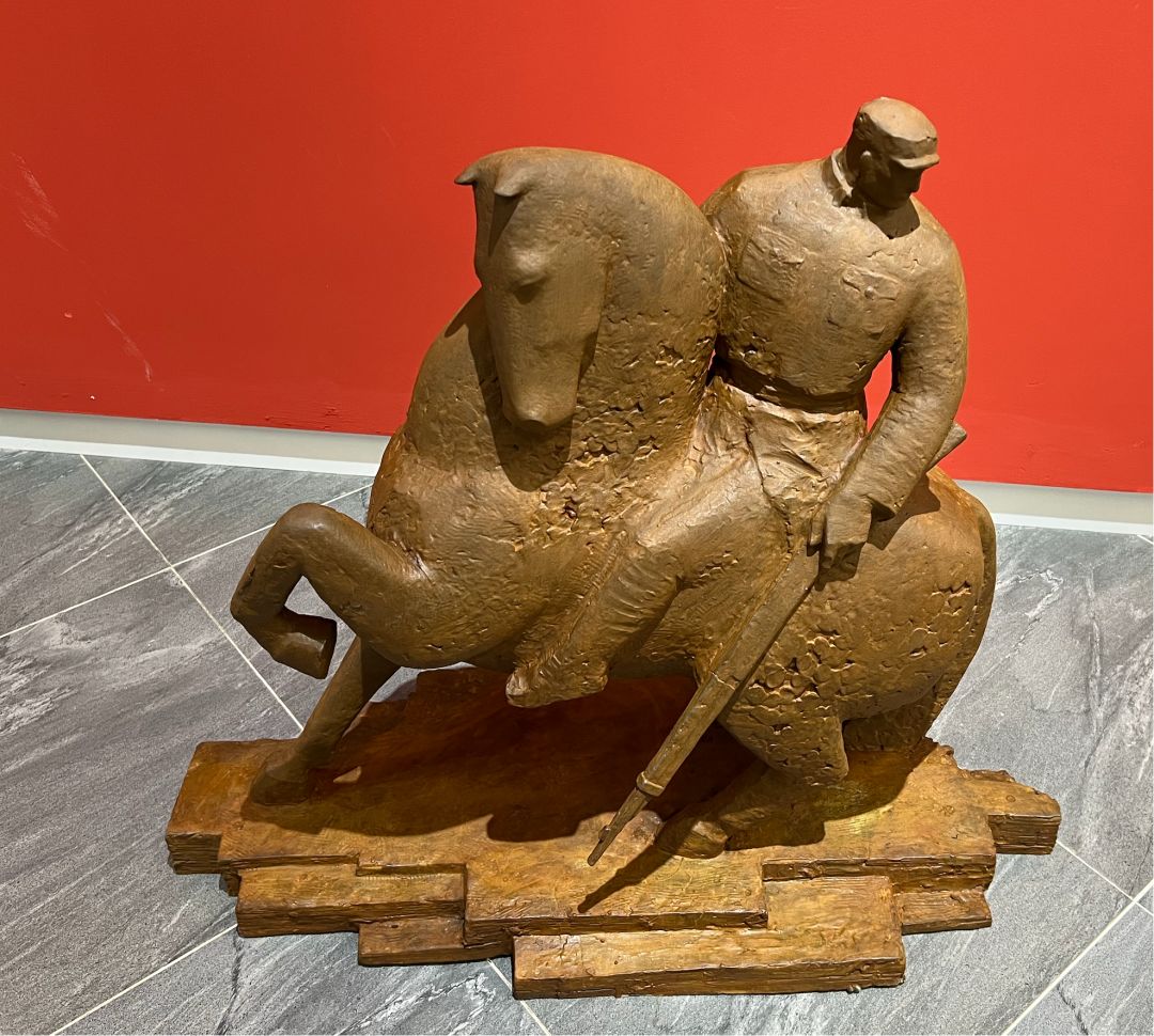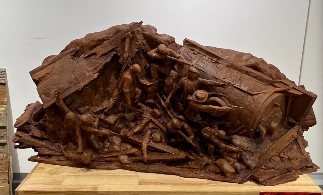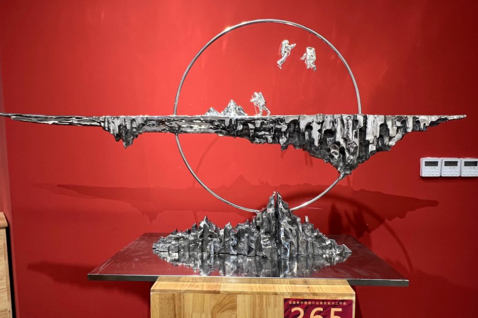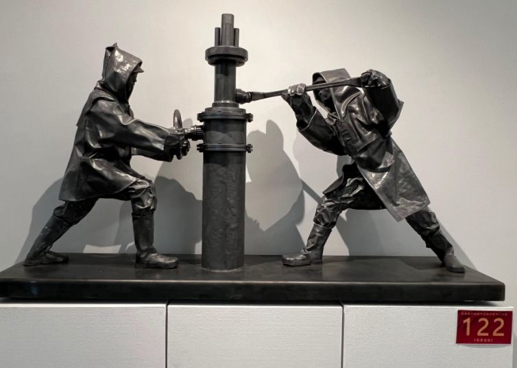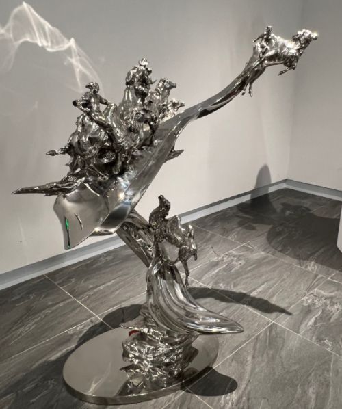 展厅内,创作者们以泥土为语、石材为言、金属为思,将对传统与现代的深刻理解,和对社会与个体的独特感悟,融入到雕塑的造型与肌理之中。展览分为三大篇章,分别位于美术馆一至三层:第一篇章“我们所承载的”聚焦历史的厚度、家国的使命与集体的记忆,如作品《启航》《征程之骑映山河》等,以石材、金属等材料凝固民族面貌与革命精神;第二篇章“我们所感受的”着眼于生活的温度以及思维的表达,《使命》《平凡的高度》等作品展现出青年艺术家对现实生活的细腻捕捉;第三篇章“我们所构想的”则指向未来探索与观念实验,运用新媒体、互动装置等创新手法,突破传统雕塑边界。