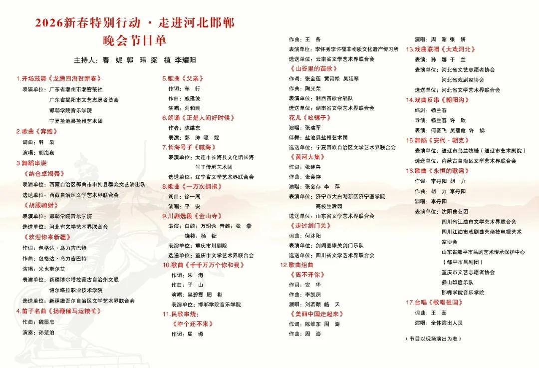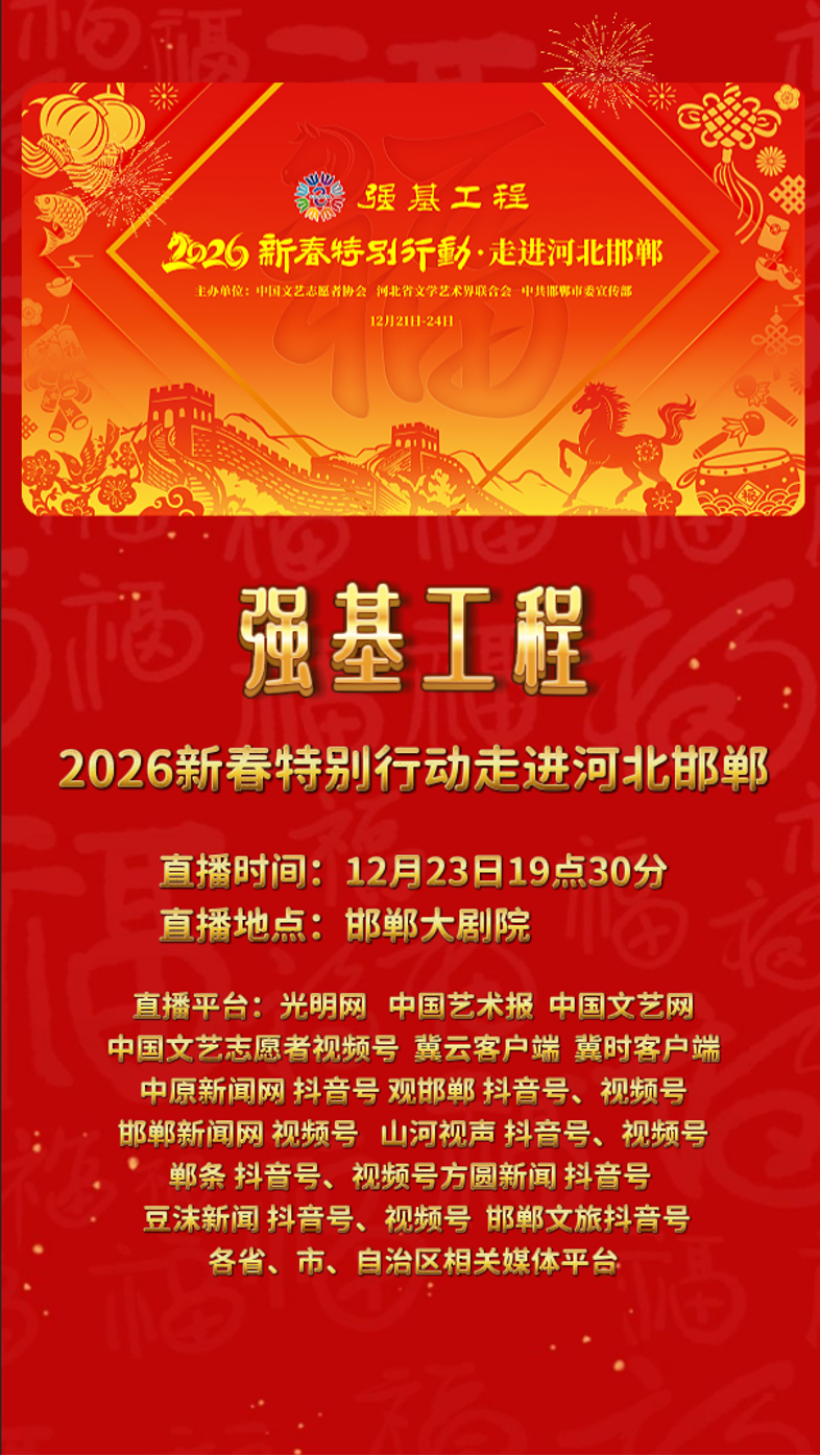 由中国文艺志愿者协会、河北省文联、中共邯郸市委宣传部主办的强基工程?2026新春特别行动走进河北邯郸文艺演出,将于12月23日19:30在邯郸大剧院上演。节目将在光明网、中国艺术报、中国文艺网、中国文艺志愿者视频号、冀云客户端、冀时客户端、中原新闻网抖音号;观邯郸抖音号、视频号;邯郸新闻网视频号;山河视声抖音号、视频号;郸条抖音号、视频号;方圆新闻抖音号;豆沫新闻抖音号、视频号;邯郸文旅抖音号;各省、市、自治区相关媒体平台同步直播。