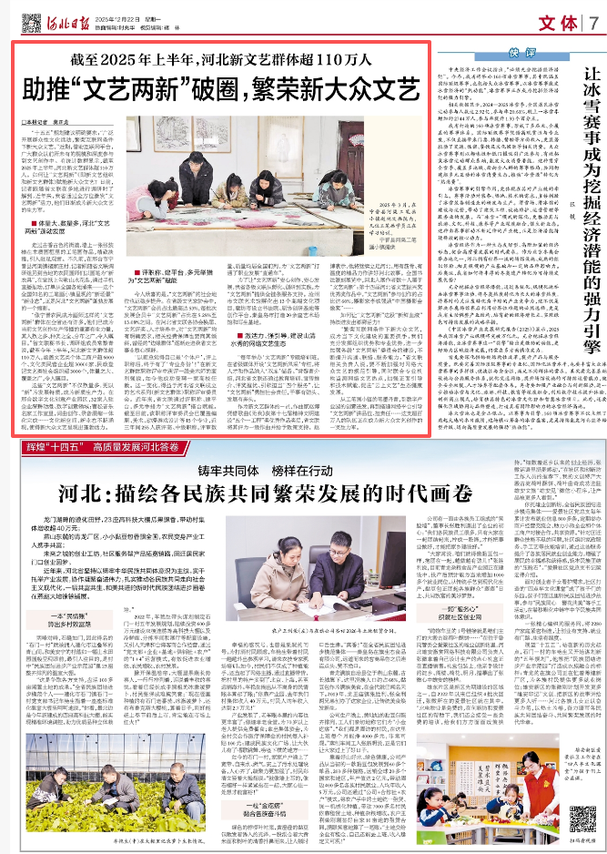 12月22日,河北日报刊发文章《截至2025年上半年,河北新文艺群体超110万人 助推“文艺两新”破圈,繁荣新大众文艺》,围绕河北省文艺文联工作如何引导“文艺两新”(即新文艺组织和新文艺群体)赋能新大众文艺进行分析解读,现予以转发。