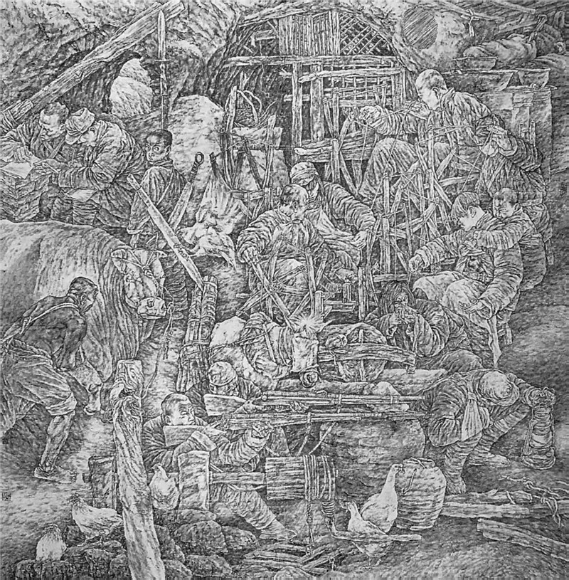 于长江、陈嵘、钱宗飞、吴涛毅合作《民兵史画长卷》(局部) 248cm×246cm 1999年