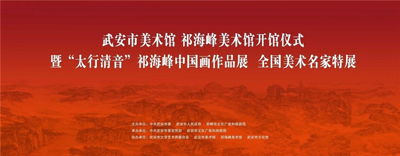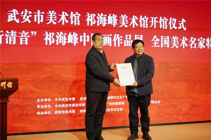 1月22日,祁海峰美术馆(暨武安市美术馆)在武安市正式落成开馆,中国文联副主席、河北省文联主席边发吉,河北省文联党组书记、副主席高天,中国美协原分党组书记、驻会副主席、秘书长徐里,中国美协副主席马锋辉,河北省文联党组成员、副主席任源,河北广播电视台党委委员、机关党委书记张丽娜,邯郸市委常委、宣传部部长许红琳,中国传媒大学原党组书记、中央数字电视书画频道总裁李培元等有关单位领导,刘金凯、夏荷生等国内艺术界知名艺术家、文化学者代表,省市县各级文联、美协、美术馆代表,武安市委、市政府等当地有关单位代表,武安市美术师生代表和广大市民以及各界友人共同见证了这一时刻。武安市人民政府市长李同强主持开馆仪式。