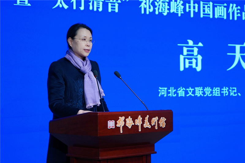 高天代表省文联对美术馆开馆表示热烈祝贺,并向所有关心支持河北文艺事业的各界人士致谢。她在讲话中高度评价了祁海峰的艺术成就与社会贡献,指出祁海峰作为从武安走出的全国美术领军人物,其创作生动展现了燕赵大地的壮美山川、灿烂文化与时代精神。她表示,美术馆的建成不仅为人民群众提供了高品质的艺术共享空间,提升了城市文化品位,更将成为展示河北形象、传播燕赵文化的重要窗口,为地方文化建设和文艺繁荣注入新动力。河北省文联将持续关注祁海峰美术馆的运行,积极整合资源,支持美术馆发挥更大作用。