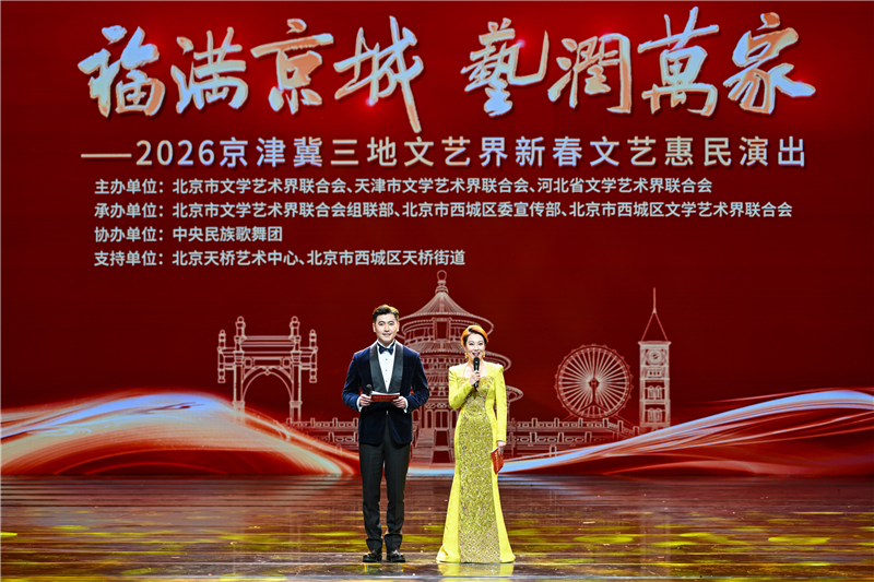 1月20日,由北京市文联、天津市文联、河北省文联共同主办的2026京津冀三地文艺界新春文艺惠民演出在北京天桥艺术中心举办。中国作家协会党组成员、副主席、书记处书记邱华栋,中国文联党组成员、书记处书记谢力,北京市文联主席韩子荣,北京市文联党组书记、常务副主席马新明,河北省文联党组书记、副主席高天,北京市文联党组成员、副主席韩云升,天津市文联党组成员、二级巡视员刘志勇等出席活动。