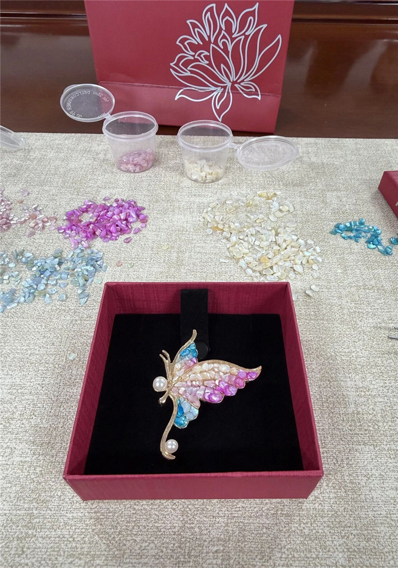 活动现场暖意融融、氛围热烈,琳琅满目的螺钿原料、精致胸针底托与手工工具整齐摆放。活动特邀非遗工艺老师现场授课,系统介绍螺钿技艺的历史渊源、文化内涵与制作流程,从选料、裁切、拼贴到镶嵌、打磨、固定,逐一示范讲解关键技法,让大家直观感受传统非遗工艺的独特魅力。